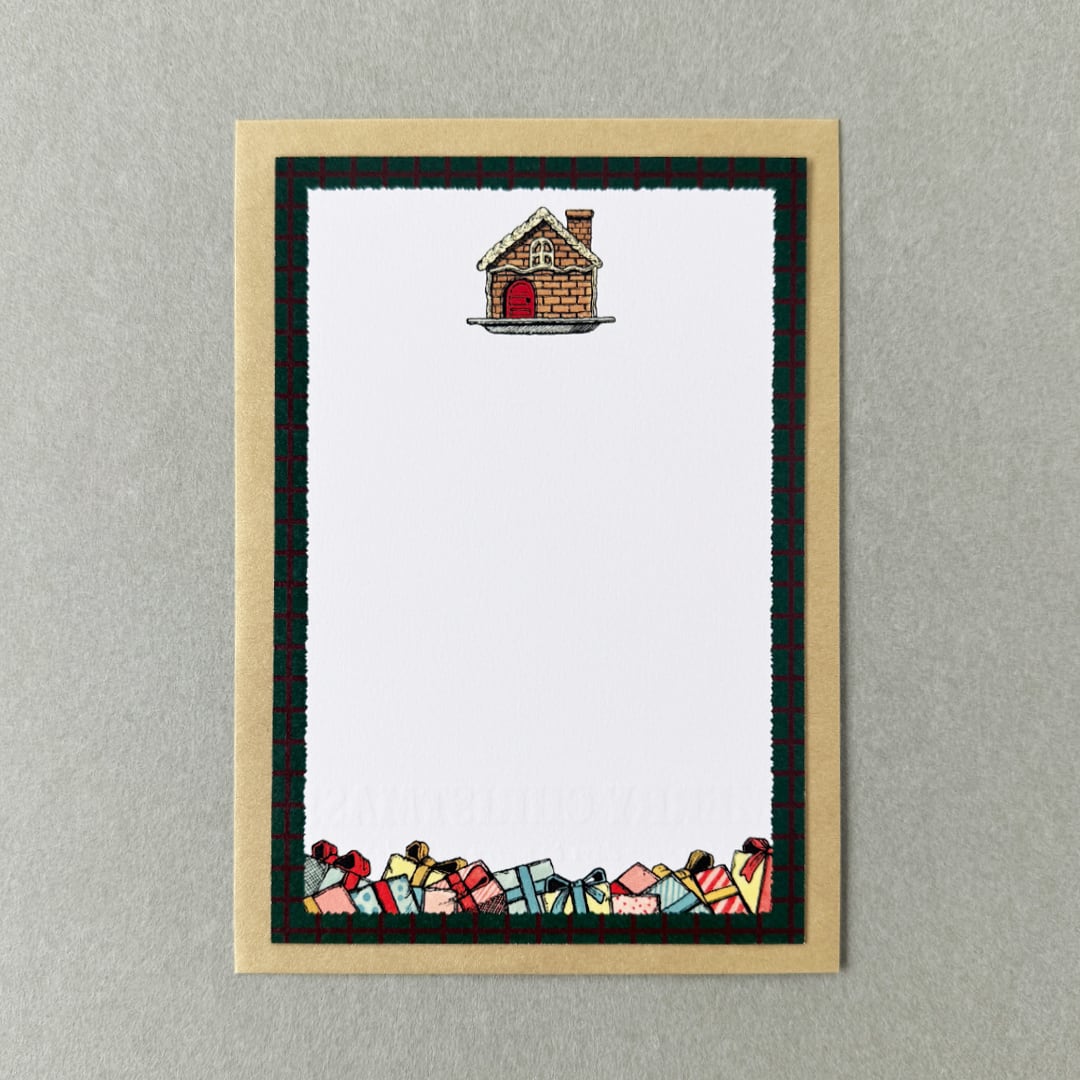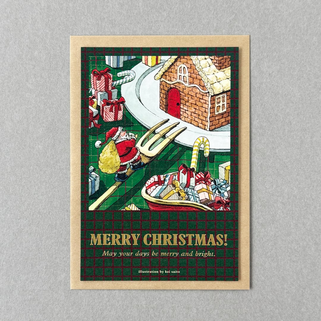 『お菓子の家』をテーマにしたクリスマスのグリーティングカードセットです。カードの裏面にメッセージを書いて封筒に入れて送る、カードは部屋に飾って封筒は別の用途に使うなど色々な使い方ができるステーショナリーです。