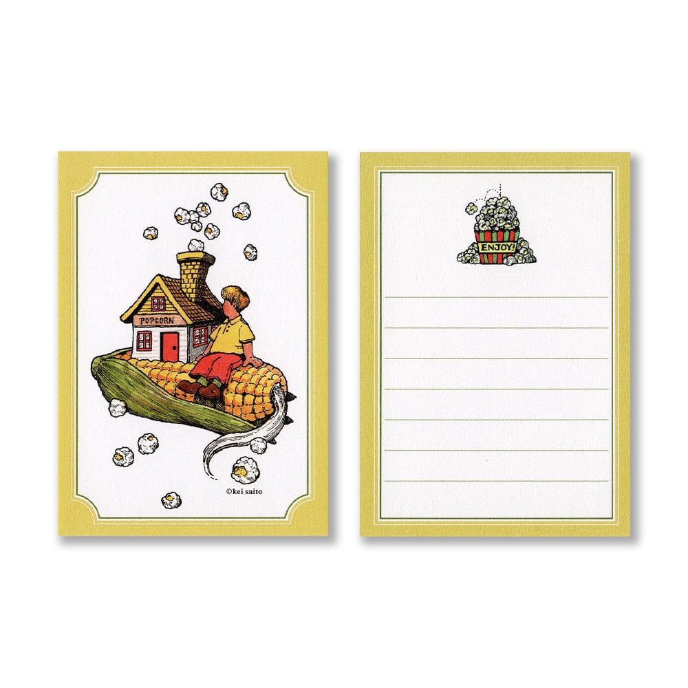『ポップコーンの家』がモチーフのミニカードセットです。厚めのしっかりとした紙に印刷しています。裏は罫線が入っているので、ちょっとしたメッセージを書く一筆箋として、プレゼントに添えるカードなどにお使いいただけます。