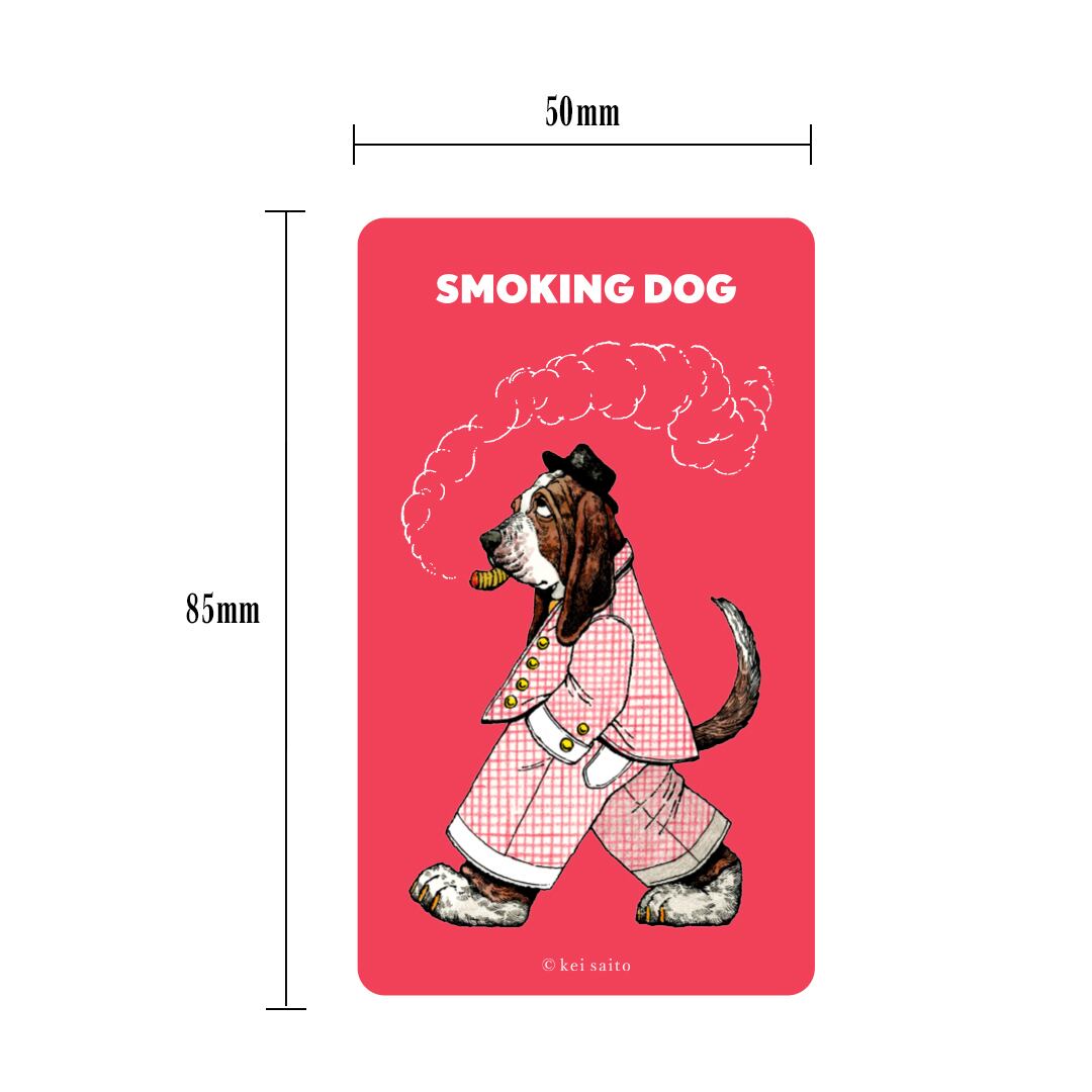 SMOKING DOG(バセットハウンド)のオリジナルステッカーです。耐候性があるため、屋内・屋外問わず、様々な場面でご使用頂けます。また手のひらに収まるサイズのため、小物などにもに貼りやすい大きさになっています。是非色々な場所に貼ったり、挟んだりして楽しんで頂けたら嬉しいです。